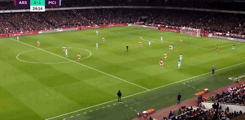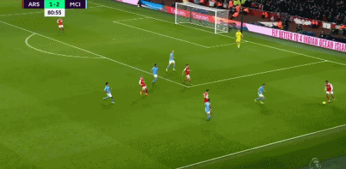 第82分钟,右路的德布劳内倒三角回传,中路的哈兰德左脚停球右脚马上捅射远角,曼城3-1阿森纳。