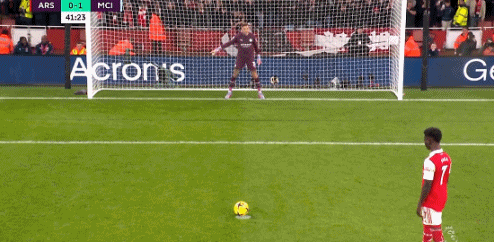 第39分钟,恩凯蒂亚在射门之后被埃德森撞倒,裁判判罚了点球,萨卡主罚命中,1-1。