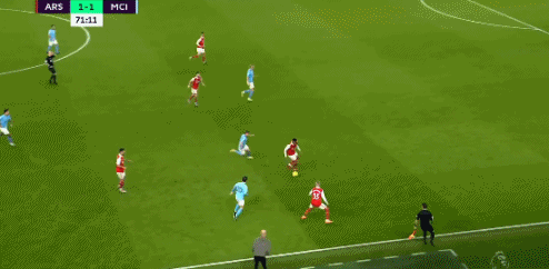 第72分钟,哈兰德在前场拿球横传,中路的京多安顺势再塞左路,无人防守的格拉利什推射破门,曼城2-1领先阿森纳。